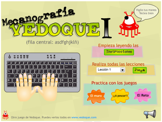 Vedoque.com es un curso que mezcla juegos con las típicas lecciones de mecanografía, para intentar hacer más divertido el aprendizaje. Coloca bien los dedos que el vedoque Monojo vigila tus manos.